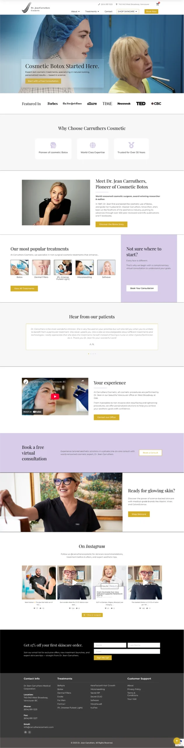 Carruthers has an established brand rooted in medical-aesthetic excellence, but their existing site needed modernization: faster load times, stronger visual presentation and easier backend management. The website needed to reflect their unique legacy (e.g., pioneering use of Botox) while supporting educational content, an elevated brand aesthetic befitting a high-end clinic, online retail of more than 100 skincare and cosmetic products, and seamless integration of treatment booking and e-commerce